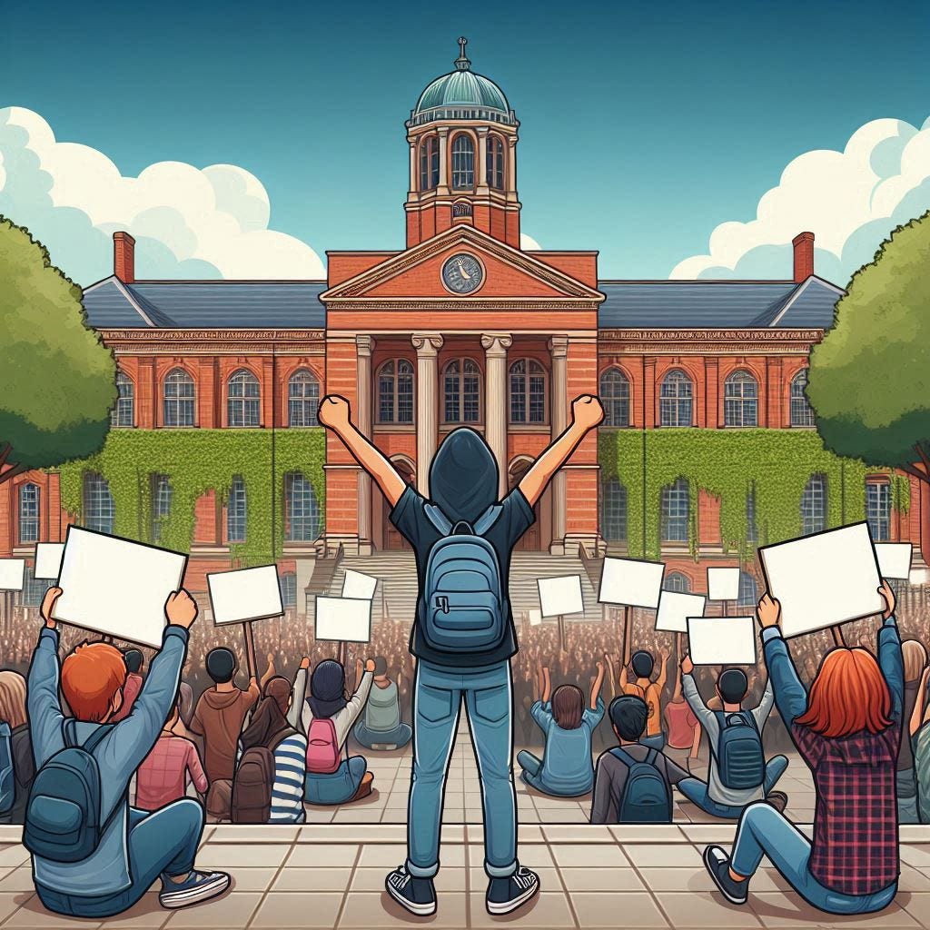 (A.I. cartoon of student protest generated by Microsoft Copilot)